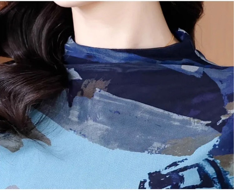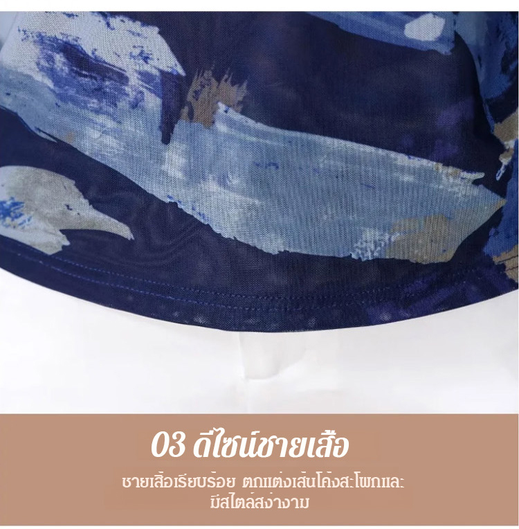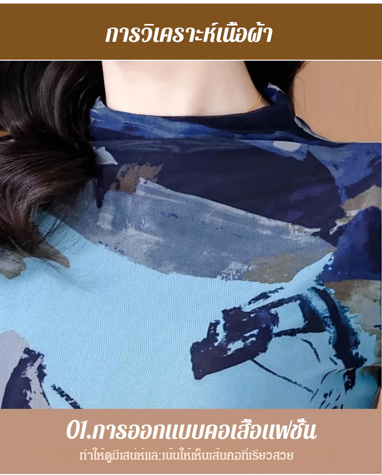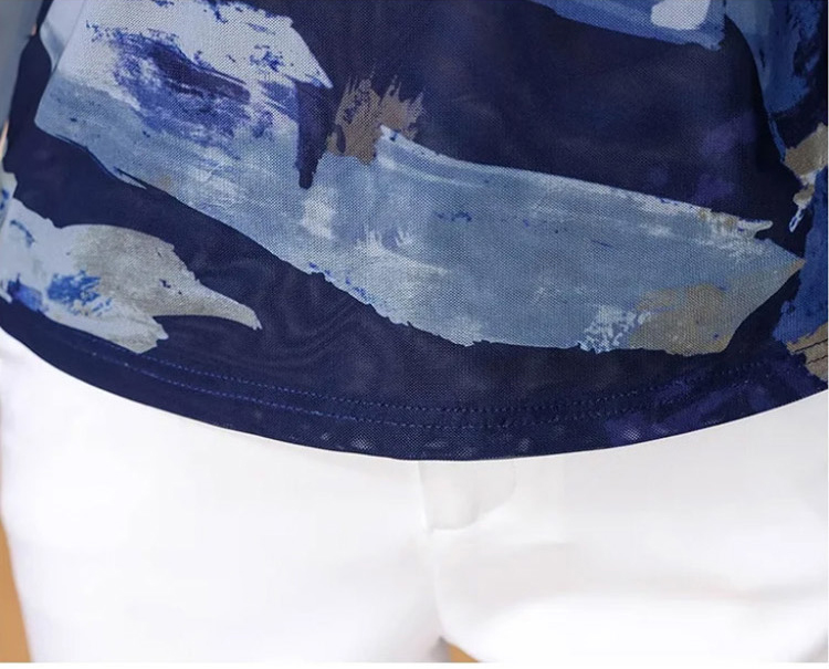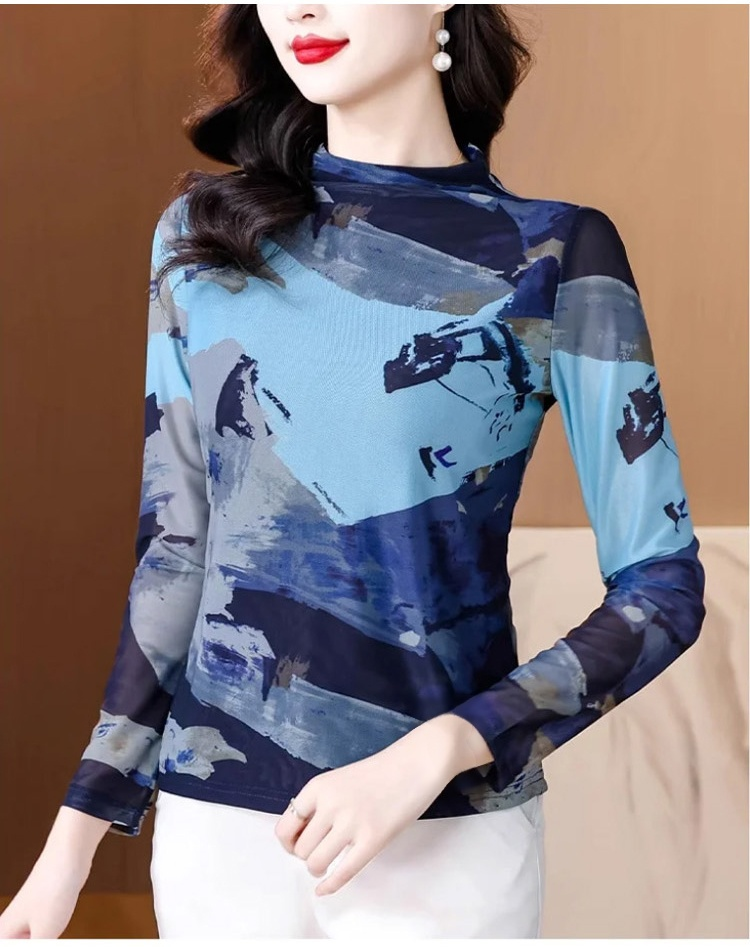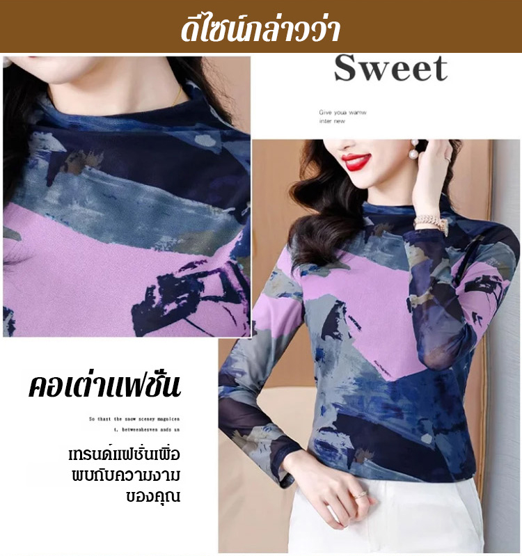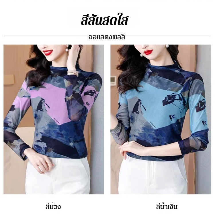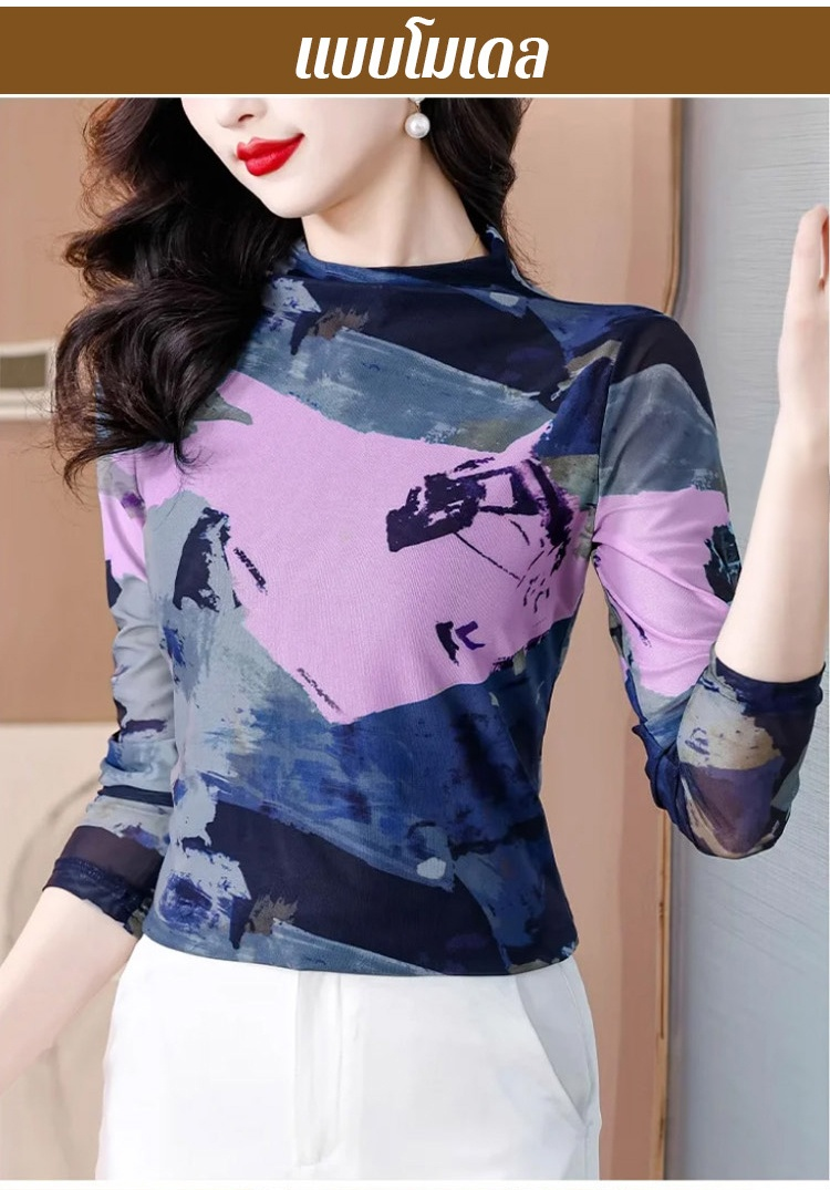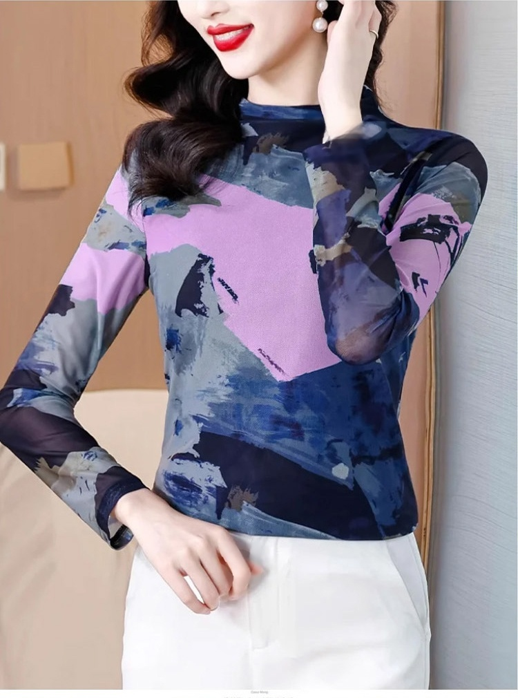 เสื้อยืดคอเต่าผ้าตาข่ายสองชั้นพิมพ์ลายแฟชั่นฟิตตัว